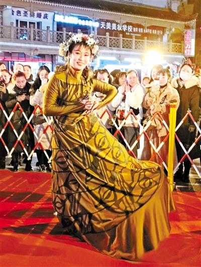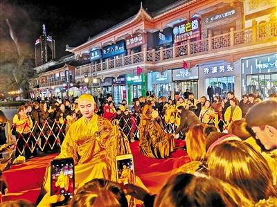 當晚7時許,途經表演現場的人流從四面八方聚攏于此,人們頻頻舉起手機將鏡頭對向眼前裙袂飛揚、舞姿優美的“大地灣女神”和頷首微笑、靜若處子的“東方微笑”,一時間,閃光燈忽明忽暗此起彼伏,行人你來我往人聲鼎沸,步行街頃刻間歡聲笑語、熱鬧非凡。記者發現,扮作“不倒翁”的“女神”模仿大地灣出土的人頭瓶外部特征,而一旁采用懸浮藝術呈現的“小沙彌”,打禪靜坐、頷首微笑。