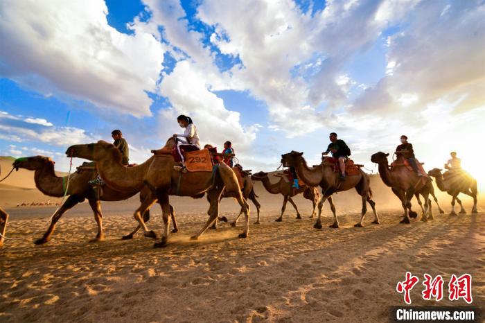 圖為游客騎駱駝暢游鳴沙山。 王斌銀 攝