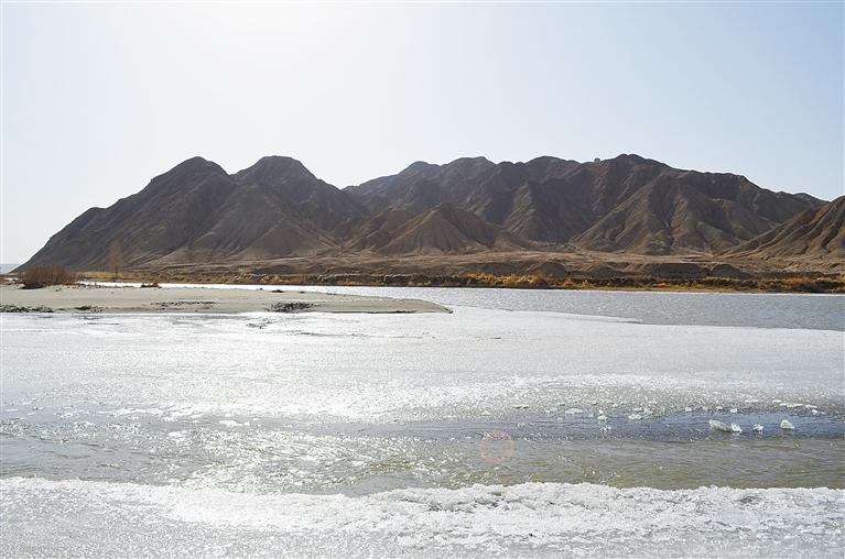找到離它最近的路段,停下車,我踩著河沙到近處一睹它的容顏。它水量的豐沛超出了我的想像,岸邊是晶瑩剔透的河冰,再往中間便是汩汩流淌的河水了,河面有的地方寬達二三十米,在它兩邊,河水浸潤之下,便滋潤出成串的濕地,有蘆葦茂盛得像是江南水鄉。