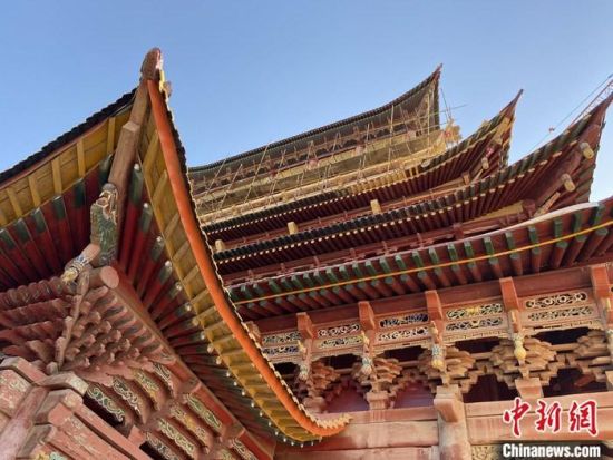 圖為5月上旬,甘肅山丹縣大佛寺內,正在修繕中的古建筑大雄寶殿。 中新社記者 高展 攝