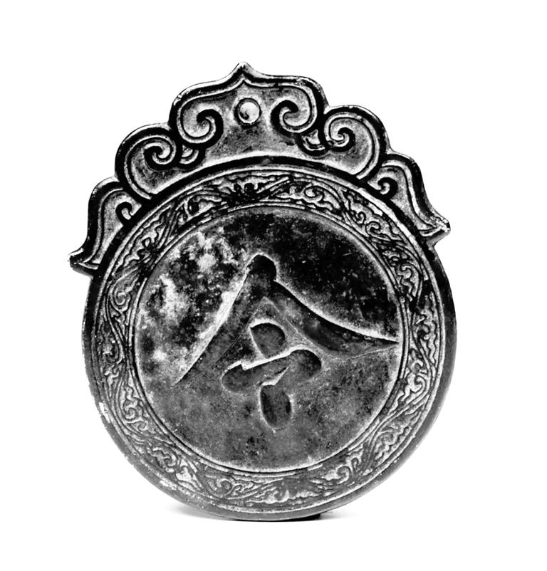 夜巡牌,高14厘米,寬11.5厘米,厚0.5厘米,紅銅制作。大體呈圓形,上面是狀如柿蒂形的鈕,鈕上雕刻有卷云紋,有一孔,用來穿繩。牌的正面為一楷書“令”字,字外三道弦紋,夾一圈卷云紋,背面為“肅字捌佰肆拾伍號”“永昌衛指揮使司夜訓牌”。
