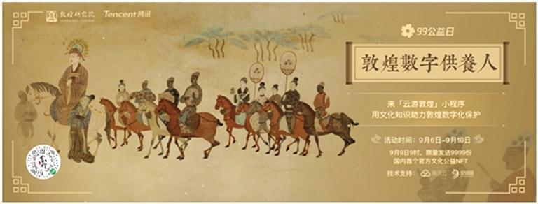 除了創意互動帶來的新奇體驗,敦煌研究院與騰訊在“99公益日”還將發布文博行業首個公益NFT(Non-Fungible Token,非同質化通證)藏品。9月9日9時開始,用戶在“云游敦煌”小程序參與文化答題即有機會獲得這款限量數字藏品。這份NFT藏品生動呈現了《張議潮統軍出行圖》與《宋國河內郡夫人宋氏出行圖》壁畫的細節,并首次讓用戶在線上觀看到敦煌莫高窟第156窟的全景。
