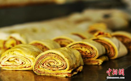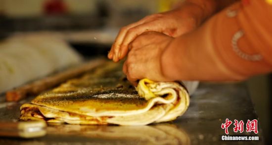 圖為將放好層層佐料的面餅拉扯,卷成筒狀。張文 攝