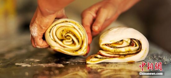 中秋節臨近,連日來蘭州市榆中縣家家戶戶開始制作傳統月餅,依照古老的技藝在大花饅頭中加入香豆、油酥、姜黃、紅曲等各種佐料,層層卷曲,色彩斑斕,狀似玫瑰。張文 攝