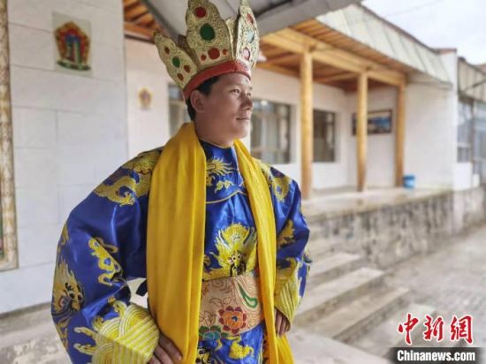 現年50歲的完代才讓換上藏戲服飾,拿著道具在舞臺上踱步高歌“南木特”藏戲《阿拉達姆》。 張婧 攝