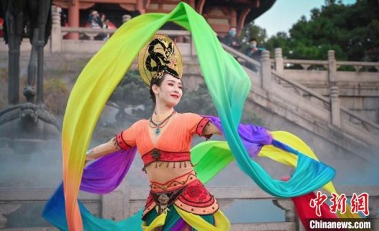11月27日,伴著幽幽古樂,婀娜多姿的伎樂飛天舞、勁健舒展的反彈琵琶舞、靈動飄逸的飛天火焰綢舞,三種不同舞動形式的敦煌舞在“江南三大名樓”之一的黃鶴樓前同時演繹。舞蹈演員時而翻轉琵琶,時而揮動絲綢,體態輕盈,翩若驚鴻,在氤氳的霧氣映襯下宛如在仙境起舞。在26日至28日舉辦的首屆中國(武漢)文化旅游博覽會上,甘肅組團推介熱門文旅,“飛天秀”是其中一項。