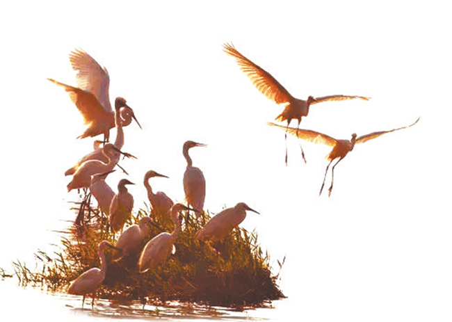 去年12月底,一位老師來西峰講學,我陪先生到濕地海綿公園轉悠,剛剛步入人行道,發(fā)現(xiàn)遠處湖水中央有七八只白鷺在棲息,朝陽斜射到湖面上,水波瀲滟,像細碎的金斑,白鷺安詳?shù)叵礈熘鹈幸恢话槅瓮戎绷⒅∷埔乐桓P直纖細的鐵絲,半張著翅膀,欲飛不飛的樣子,剩下的幾只白鷺在戲水,迷人極了。