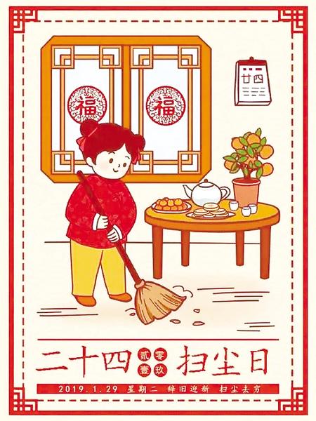 據《呂氏春秋》記載,這一風俗源于堯舜時代。臘月二十四那天,隴上人家就陸續開始打掃起來,全家老少一起動手,清掃房屋積塵,石灰刷墻,新紙裱糊仰塵,擦洗窗欞,糊上新窗紙,貼窗花或貼“窗孔子”(微型花鳥畫與書法),擦拭箱柜上的銅什件、器皿污垢,打氈抖土,拆洗被褥。一番流汗勞碌,居室煥然一新,過年的心情也更加舒暢。
