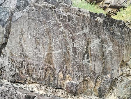 在嘉峪關四道鼓心溝巖畫《群虎圖》中,充分展現了生機勃勃的動物王國。5只猛虎隱藏在草叢中等待獵物的到來,蛇在草地上爬行,野牛、梅花鹿、北山羊迅速躲避虎群的襲擊,飛禽在空中翱翔。