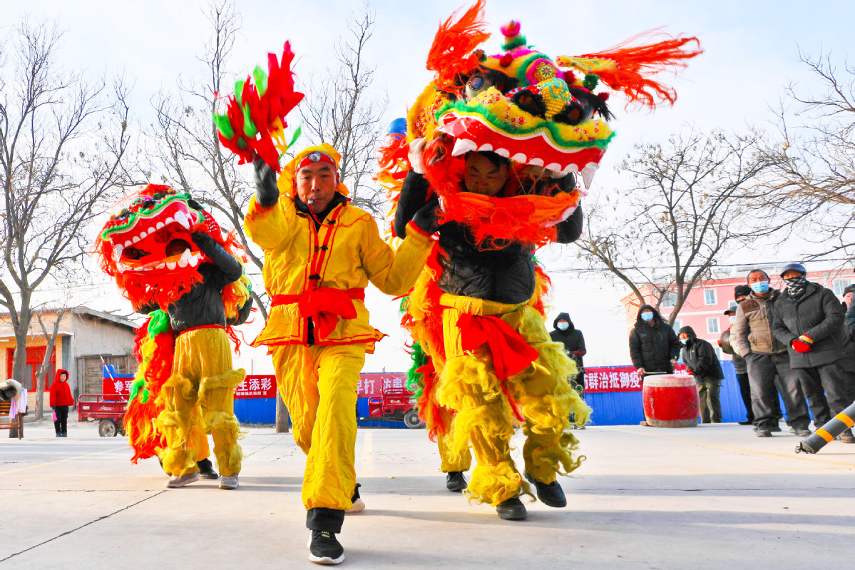 1月26日,甘肅省張掖市甘州區堿灘鎮草湖村文化廣場上,村文化隊為鄉親們表演了獅頭擺,追繡球,飆起來,威掃天下知的獅舞,迎接即將到來的新春佳節。