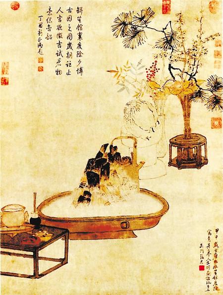 類似的畫作還有明代吳門畫派張宏的作品。畫面中心的榾柮爐中溫著一壺酒。后側果盤中盛放佛手,插花的器物則是枯瘦的青銅花觚和清麗的白瓷瓶,所插之物相應地配以墨線勾勒的梅柏和淡雅設色的天竹。