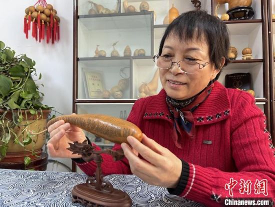 2月15日,蘭州市非遺傳承人陳兵在工作室展示自己雕刻的微雕作品,她擅長在雞蛋大小的葫蘆上雕刻敦煌壁畫、敦煌飛天,以及佛教經文,一把刻刀上下翻飛之后,雕刻形象神態逼真。