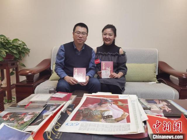 圖為陳曉斌(左)向中新網記者介紹他所收藏的舞劇《絲路花雨》相關珍貴資料情況。 崔琳 攝