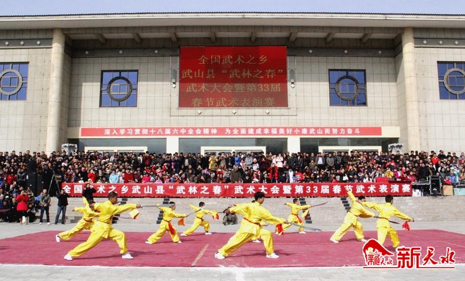 有武——武山是“全國武術之鄉”。全縣習武蔚然成風,有六合拳、八步轉等地方拳和國家套路、梅花槍、通備拳、硬氣功、太極拳等門類,常年習武人數達7萬多人,每年正月舉辦全縣武林之春武術表演大會。