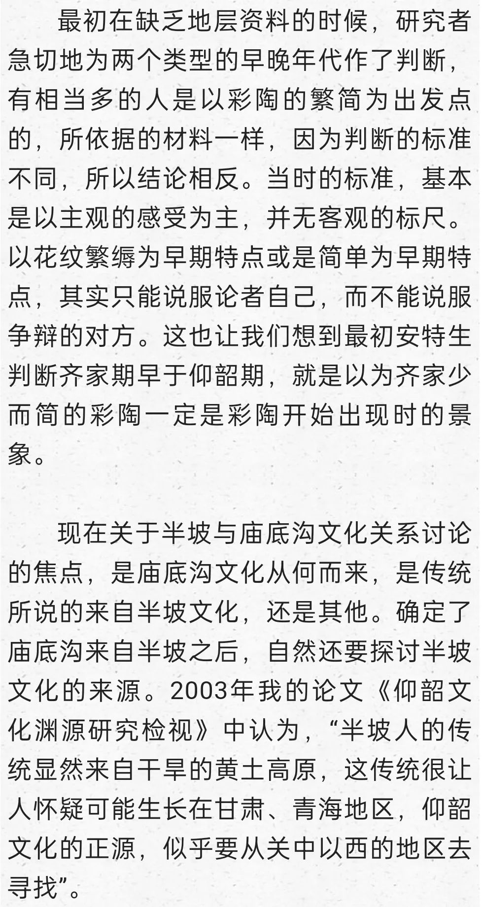 在這里明確提出到甘青尋找仰韶文化的正源,后來我又寫成《秦安大地灣遺址彩陶研究》,討論甘青彩陶的序列,也表達了類似觀點:“甘肅及青海東部地區在距今6000年前左右,就已經是仰韶文化的分布區域,馬家窯文化彩陶的來源應當就在這個本土區域,應當就是仰韶時期的廟底溝文化。從文化的分布與地層堆積關系找到了甘肅地區考古學文化明確的傳承關系,由彩陶紋飾演變的考察也能尋找到傳承的脈絡”。