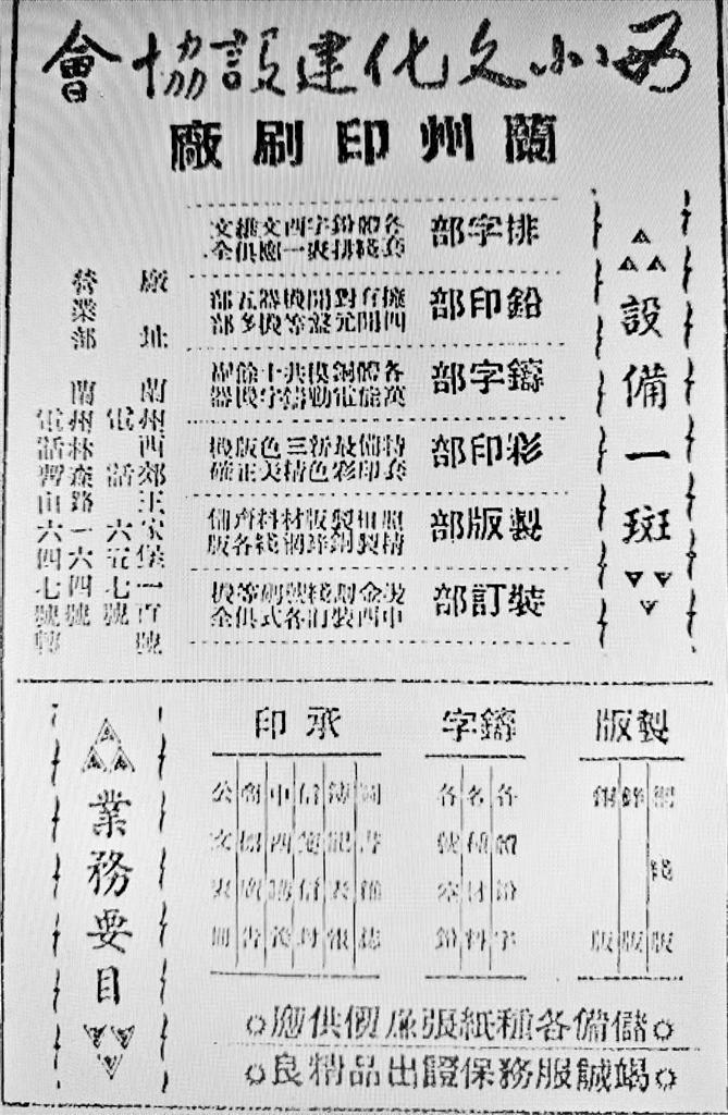 個別有實力的印刷廠也通過廣告拓展業務。如創辦于1947年9月的西北文化建設協會蘭州印刷廠是當時甘肅規模較大的印刷廠之一,曾印制過《蘭州古今注》《花兒集》《西北論叢》《新光》等書刊。據當年廣告所載,該廠內設排字部、鉛印部、鑄字部、彩印部、制版部、裝訂部,承印范圍亦頗廣,包括圖書雜志、傳記表報、信箋信封、中西講義、商標廣告、公文表格等。