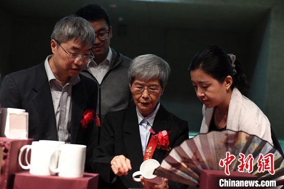 2018年8月,樊錦詩(中)在莫高窟數字陳列中心參觀文創產品。(資料圖) 楊艷敏 攝