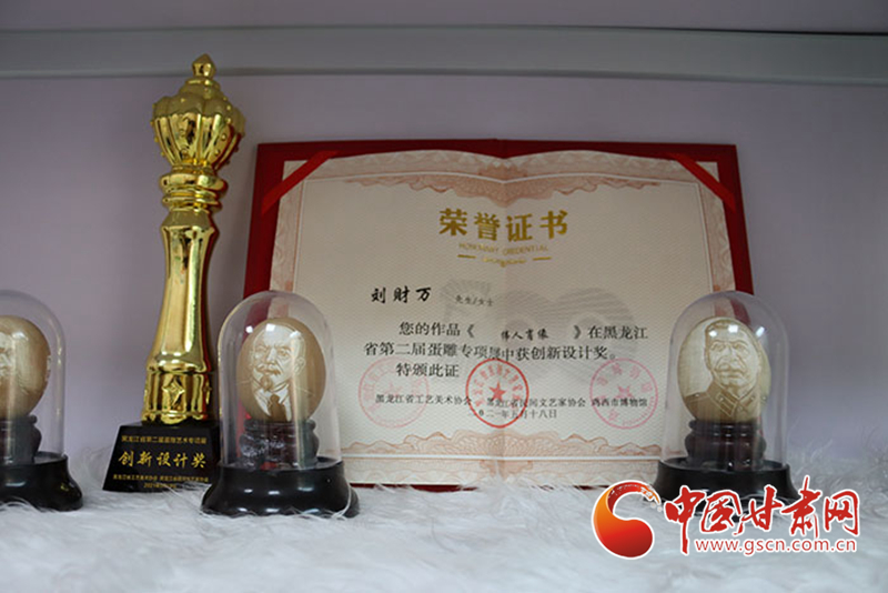 記者在采訪中注意到,社區的展柜一角擺放著不少獲獎證書,其中一張是在2021年的全國蛋雕專項展上,為劉財萬作品《偉人肖像》頒發的創新設計獎證書。“目前正在為全國蛋雕藝術聯展作準備”,當記者問起下一步打算時,劉財萬顯得信心十足。