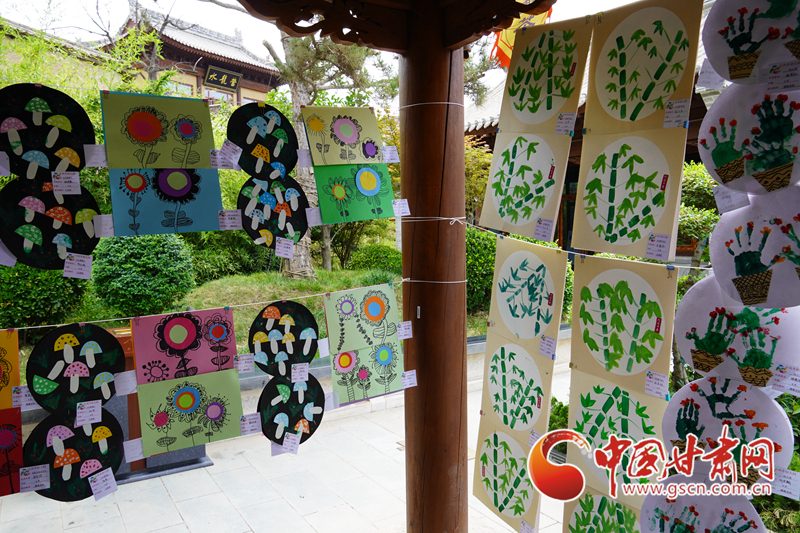 天水古城里的長廊上展示著孩子們的繪畫、手工作品,將兩側長廊掛滿,不少人駐足觀賞。