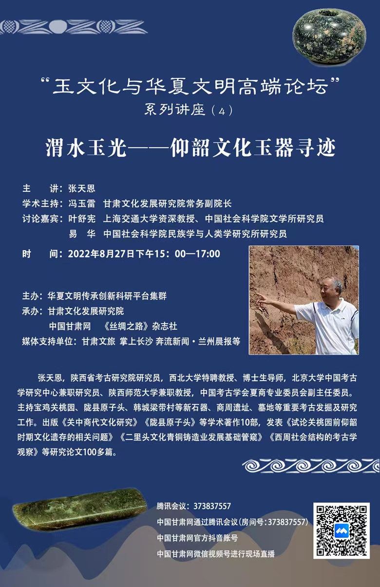 中國甘肅網8月28日訊 27日下午15:00—17:00,由西北師范大學華夏文明傳承創新科研平臺集群主辦,甘肅文化發展研究院、中國甘肅網、《絲綢之路》雜志社聯合承辦的“玉文化與華夏文明高端論壇”第四講《渭水玉光——仰韶文化玉器尋跡》成功舉辦。