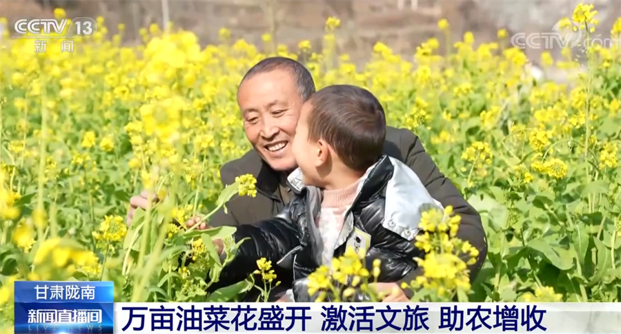 總臺記者 項思:這里是甘肅省隴南市文縣,位于甘肅的最南端,也是甘肅最早迎來春天的地方。一江碧水、兩岸青山,大面積盛開的油菜花迎著和煦的春風泛起金色的波浪,一股濃烈的春天氣息撲面而來。從春節前10天左右,這里的萬畝油菜花就陸續開放了。如今步入春天,油菜花已進入盛花期。文縣接壤四川,嘉陵江的上游白龍江穿越境內,氣候溫暖潮濕,具有夏無酷暑、冬無嚴寒的氣候特點,被稱為“隴上江南”。