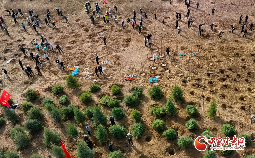 4月11日,在甘肅省張掖市甘州區黑河西岸黑河灘彩虹林海生態造林示范區內,眾多干部職工正在植樹。
