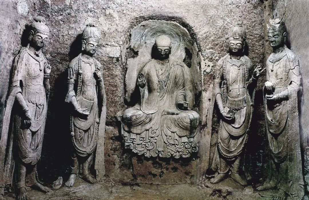 它一改西魏造像繁縟華麗、服飾厚重的特點,無論是佛、菩薩、弟子,還是飛天和力士,服飾輕柔而貼體,均展現出一種雄健挺拔、恬靜自然的氣韻,面相方圓,五官清秀而緊湊。佛低平肉髻,身穿圓領通肩或垂領式袈裟,衣裾下擺緊貼佛座,陰刻圓潤流暢的褶皺紋。菩薩也由束發高髻改為頭戴花冠,周身飾瓔珞,體姿婀娜而不失端莊。