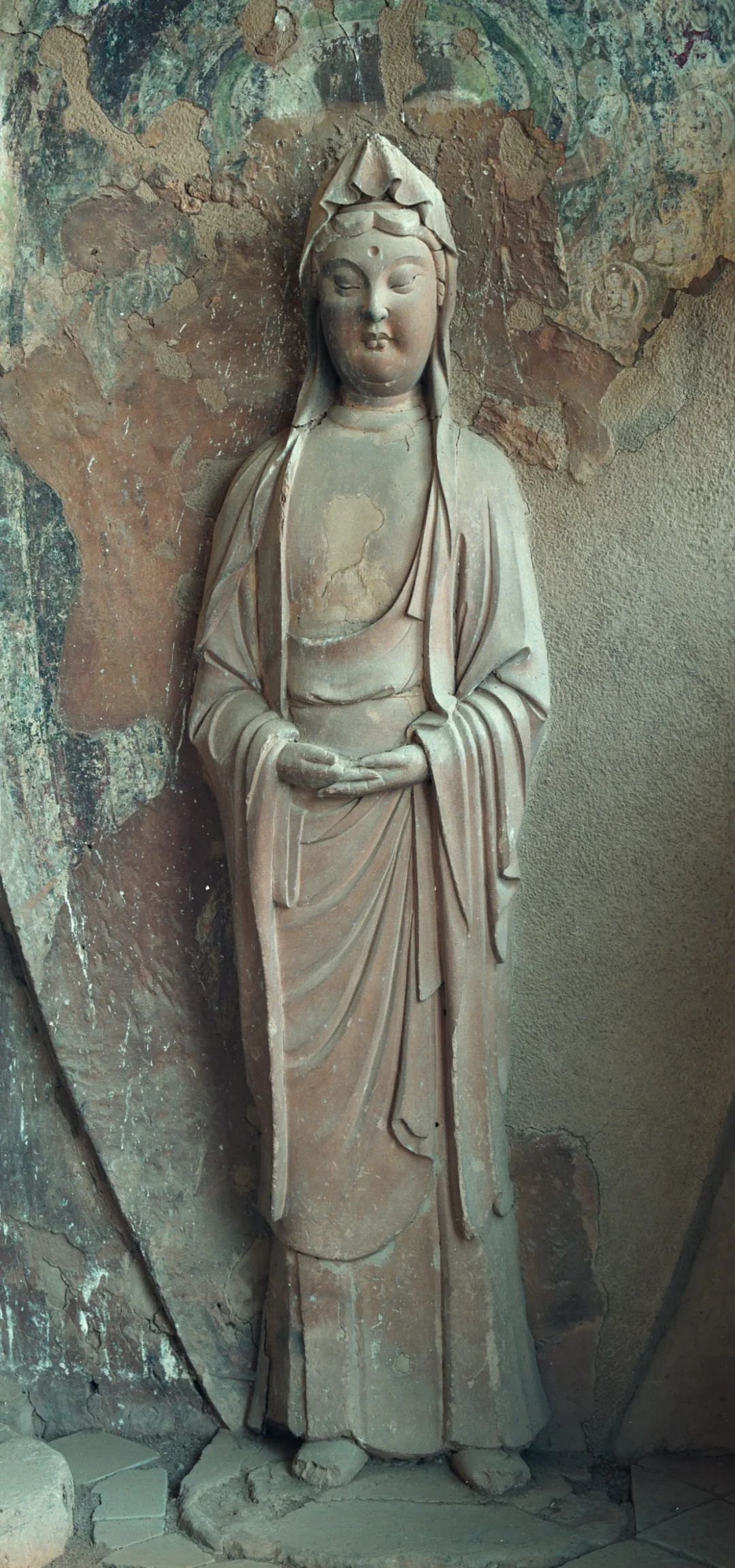 從題材上看,以單尊佛、菩薩、力士等為主,風格上更具有寫實性。造像面相橢圓飽滿,斜眉吊目,懸鼻小口,表情森嚴、凝重,服飾簡潔、質樸,寬博厚重,極富質感。其中佛低平螺髻,前置肉髻珠,身穿垂領袈裟。菩薩束發高髻或戴風帽,眉目慈祥,身材比例協調、準確。力士表情生動傳神,體形孔武雄健,充滿陽剛之氣,給人以強烈的力量和威武感;這段時間造像前衰后盛也與當時秦州所處環境有密切關系。