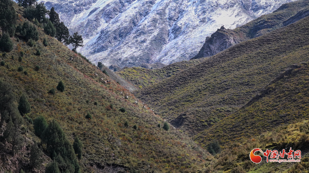 9月25日,位于甘肅省河西走廊的張掖市山丹馬場秋日初雪,遠處的祁連山上積雪與松柏交相輝映,巖羊在雪地里悠閑覓食,宛如一幅和諧的生態畫卷。