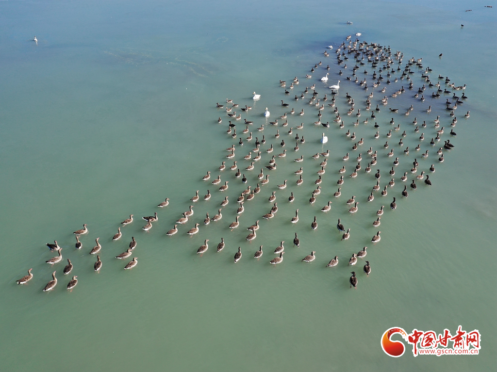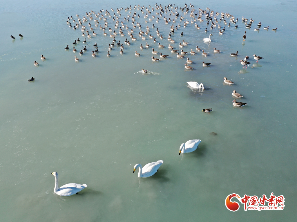 11月18日,在甘肅省張掖市臨澤縣新華農場湖面上,眾多天鵝、灰雁和綠頭鴨等候鳥在此越冬棲息。