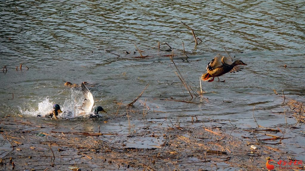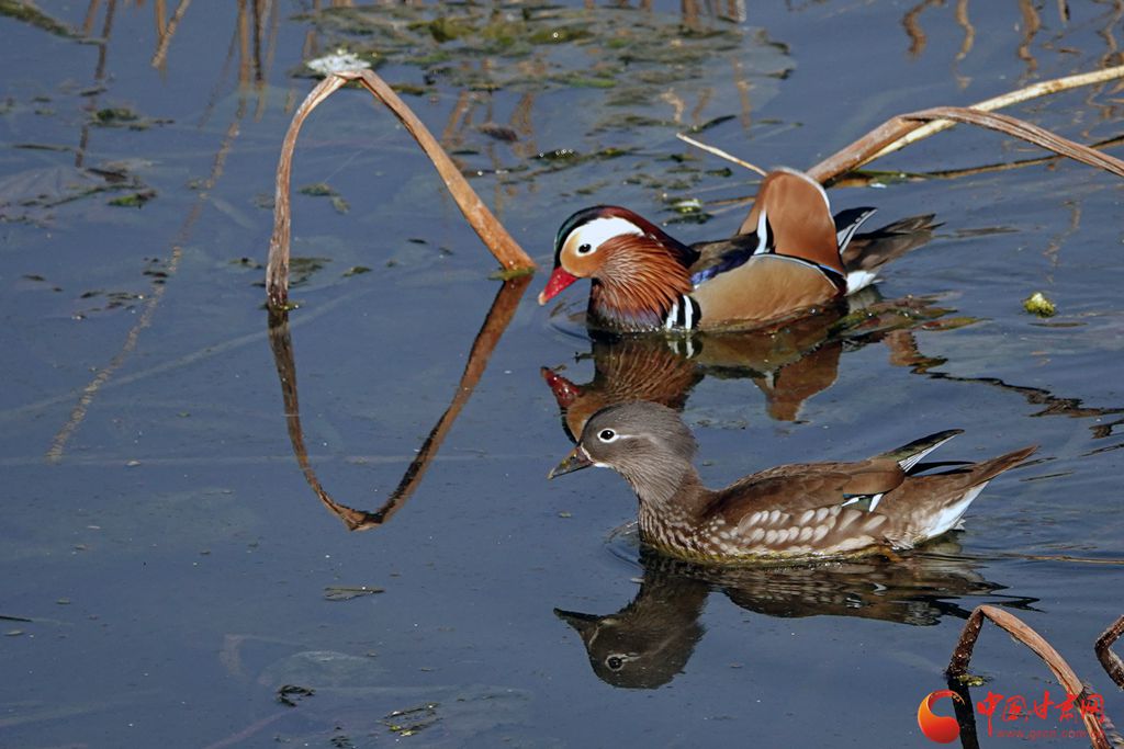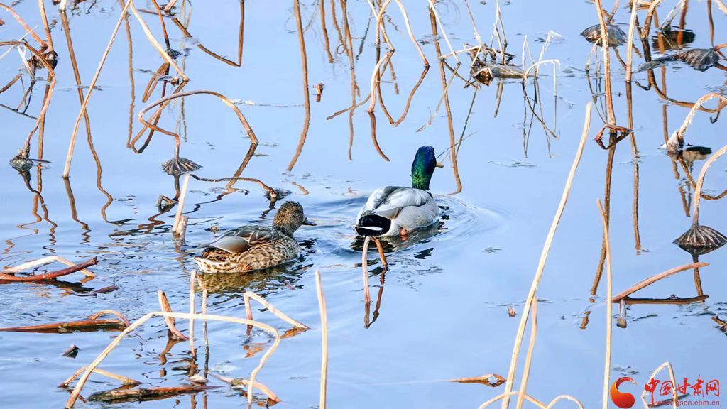 冬日的崇信縣龍澤湖,枯殘的荷葉、蓮蓬與枝干倒映水中,一株株枯荷挺著一身風骨靜靜地佇立在湖中,鳳頭鸊鷉、鴛鴦、秋沙鴨、赤麻鴨等成群結隊的候鳥在枯荷間嬉戲,舞出了不一樣的冬韻。
