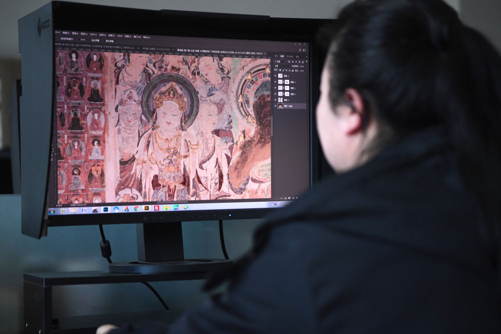 敦煌研究院文物數字化保護團隊圖像處理人員年海麗在拼接壁畫圖像(2023年4月25日攝)。新華社記者 陳斌 攝