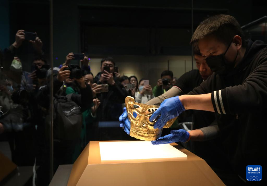 1月29日,工作人員將金面具移入展柜。