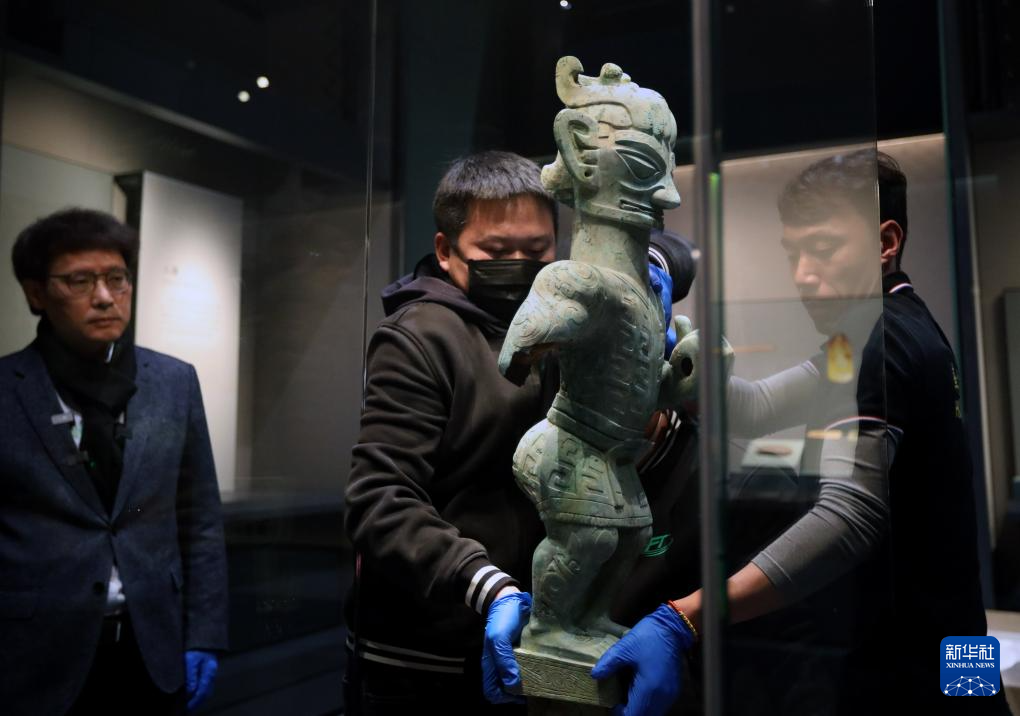 1月29日,工作人員將豎披發青銅人像移入展柜。