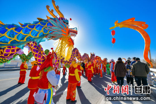 2024年2月14日,甘肅省敦煌市社火隊正在白馬塔景區進行社火——舞龍表演。