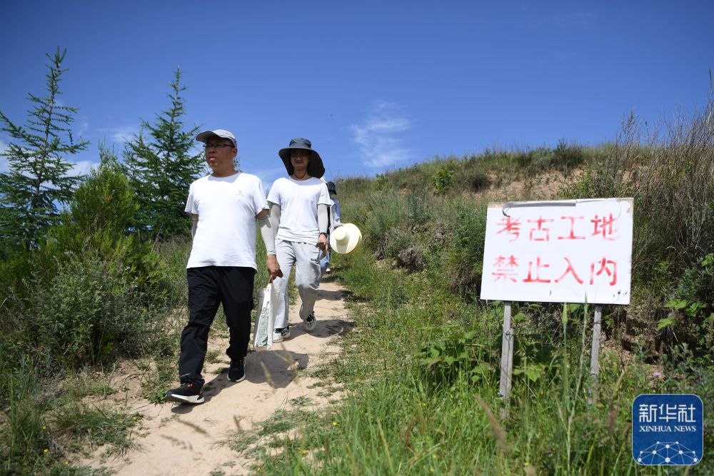 四角坪遺址考古領(lǐng)隊、甘肅省文物考古研究所副研究館員侯紅偉(前)帶領(lǐng)考古專業(yè)研究生在甘肅省隴南市禮縣四角坪遺址考古發(fā)掘現(xiàn)場工作(2022年6月10日攝)。新華社記者 郎兵兵 攝