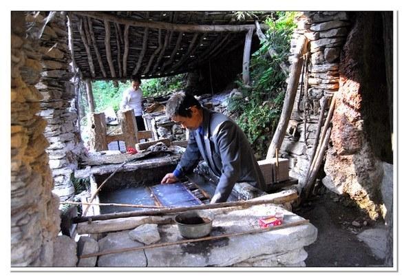 走到山麓,我們看到晶亮的小溪像一條小蛇蜿蜒而來,一個用石頭砌起的水潭上,用幾根木頭支起漁網一樣的物件,水潭上有一間同樣用石頭砌成的操作間,屋頂用石板苫蓋,四周張著篷布遮蔽陽光,這就是傳說中的紙坊嗎?