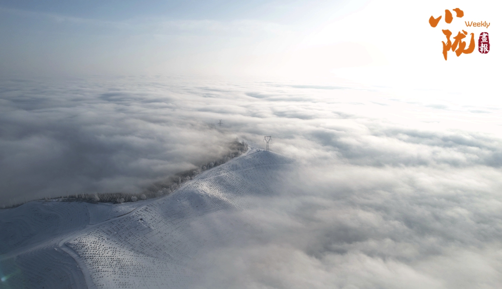 從高處俯瞰,白色的云海在大地上空翻騰涌動,時而聚攏,時而消散,田園、村莊在云霧中時隱時現,如夢如幻。