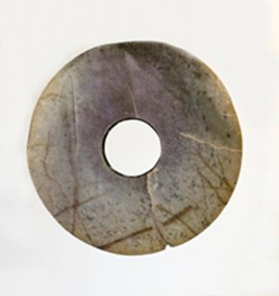 玉璧(編號(hào)總0129:5)直經(jīng)9厘米,單面鉆孔,大端孔徑4.4厘米,小端孔徑4厘米,厚度0.55—0.7厘米,璧外緣有磕碰痕。