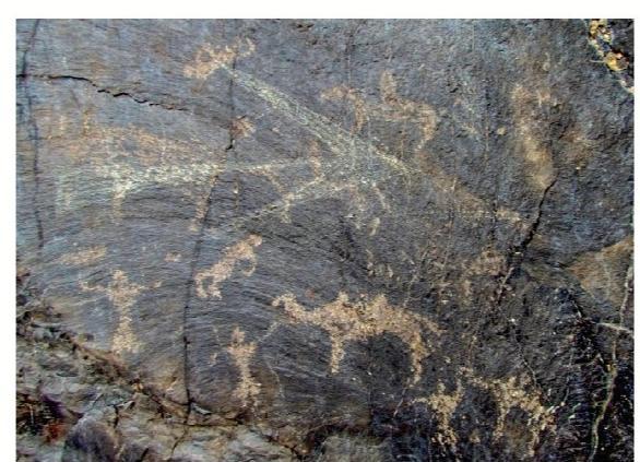黑山巖畫全稱為“黑山摩崖淺石刻巖畫”,分布于嘉峪關西北約 10—20公里處的黑山峽谷陡崖峭壁上,為遠古時期黑山地區游牧民族生產、生活的真實記錄。現共發現分布在黑山石關峽口、磨子溝、蕉蒿溝、四道股形溝、紅柳溝、交河溝六處戰國至明代時期的巖畫,共 157 幅。黑山巖畫反映的時限跨度大,時空關系復雜,涉及部族較多。畫面所反映的內容豐富多彩,有動物、人物、佛塔、植物等,還有大型的操練舞蹈場景。涉及人類學、社會學、歷史學、考古學、美術學、生物學、地理學等多個學科,具有較高的研究價值。