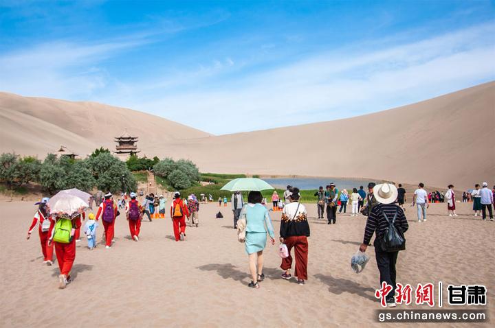 6月10日,敦煌市鳴沙山下,一場以敦煌市舞龍隊為首的20個健身舞蹈隊為廣大市民和游客獻上一臺臺精彩的舞蹈盛宴,吸引了眾多游客圍觀、拍照,在敦煌大漠度過一個難忘的端午節。王斌銀 攝