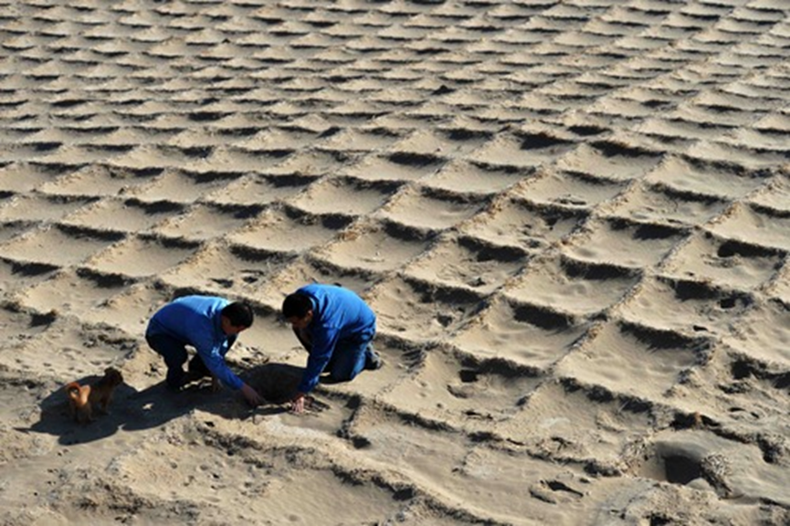 記者從敦煌研究院了解到,到2014年,經過70年持續風沙治理,風沙對敦煌莫高窟的危害顯著降低,進入窟區年積沙量減少85%以上。據敦煌研究院保護所副所長汪萬福介紹,在幾代治沙人的努力下,莫高窟頂已形成由防沙障阻沙、沙生植物林帶擋沙、麥草方格沙障固沙和礫石壓沙組成的風沙防治綜合體系,極大減緩了風沙對敦煌壁畫和塑像等文物的危害,改善了窟區生態環境。圖為2014年8月29日,兩名工作人員檢查用于固沙的麥草方格。新華社記者陳斌攝