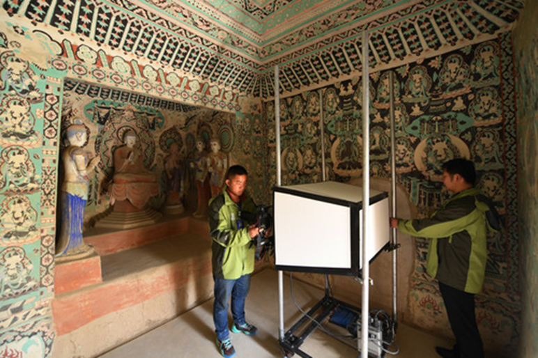 圖為在敦煌莫高窟第376窟,工作人員開展數字化采集工作(2017年4月17日攝)。新華社記者范培珅攝