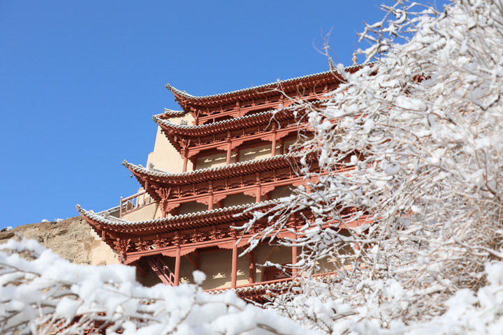 2022年3月24日至25日,甘肅省敦煌市迎來一場春雪。雪后的世界文化遺產敦煌莫高窟銀裝素裹,景色如畫。圖為3月25日拍攝的雪后的敦煌莫高窟景區九層樓。新華社記者李俞輝攝