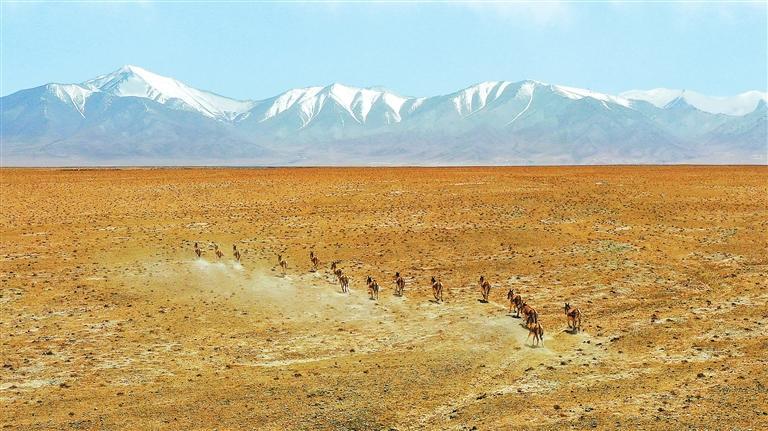 夏日的甘肅鹽池灣國家級(jí)自然保護(hù)區(qū)雪山巍峨,景色壯美。一群藏野驢時(shí)而追逐奔馳,時(shí)而悠閑覓食;大批北歸遷徙的候鳥自由翱翔,盡顯大自然的和諧之美。
