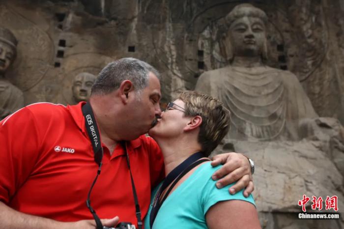 兩名外國游客在河南洛陽龍門石窟盧舍那大佛前拍照留念。徐崇德 攝