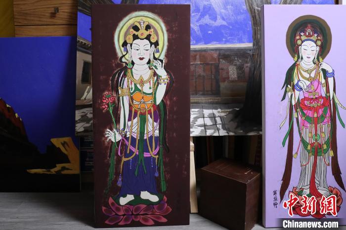 北京外國語大學藝術研究院院長寧強以敦煌莫高窟壁畫為靈感創作的繪畫作品。 徐雪瑩 攝