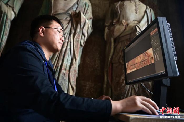甘肅天水,工作人員在麥積山石窟內檢查數字化掃描的造像和壁畫信息。九美旦增 攝