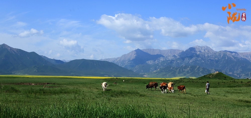 一眼望去,碧綠一片,風(fēng)景秀美。羊群放牧于焉支山下的大草原上,金黃的油菜花、無邊的草原,氣勢(shì)壯觀。