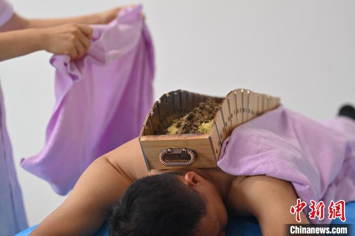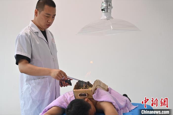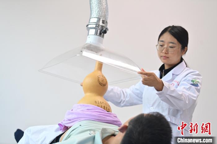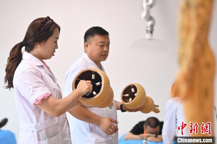 7月16日,甘肅省平涼市靈臺縣皇甫謐針灸康養館內,工作人員對患者進行葫蘆灸治療。2006年,靈臺皇甫謐針灸術入選第一批甘肅省非物質文化遺產名錄。靈臺作為皇甫謐故里,當地民眾非常認可中醫康養,針灸、拔火罐、推拿、葫蘆灸、火龍灸(督脈灸)等中醫特色療法受到了很多人的青睞,當地官方也通過舉辦大型節會等助推中醫康養產業發展。 皇甫謐是針灸醫學鼻祖,其《針灸甲乙經》已在多個國家被廣泛傳播應用。中新社記者 李亞龍 攝